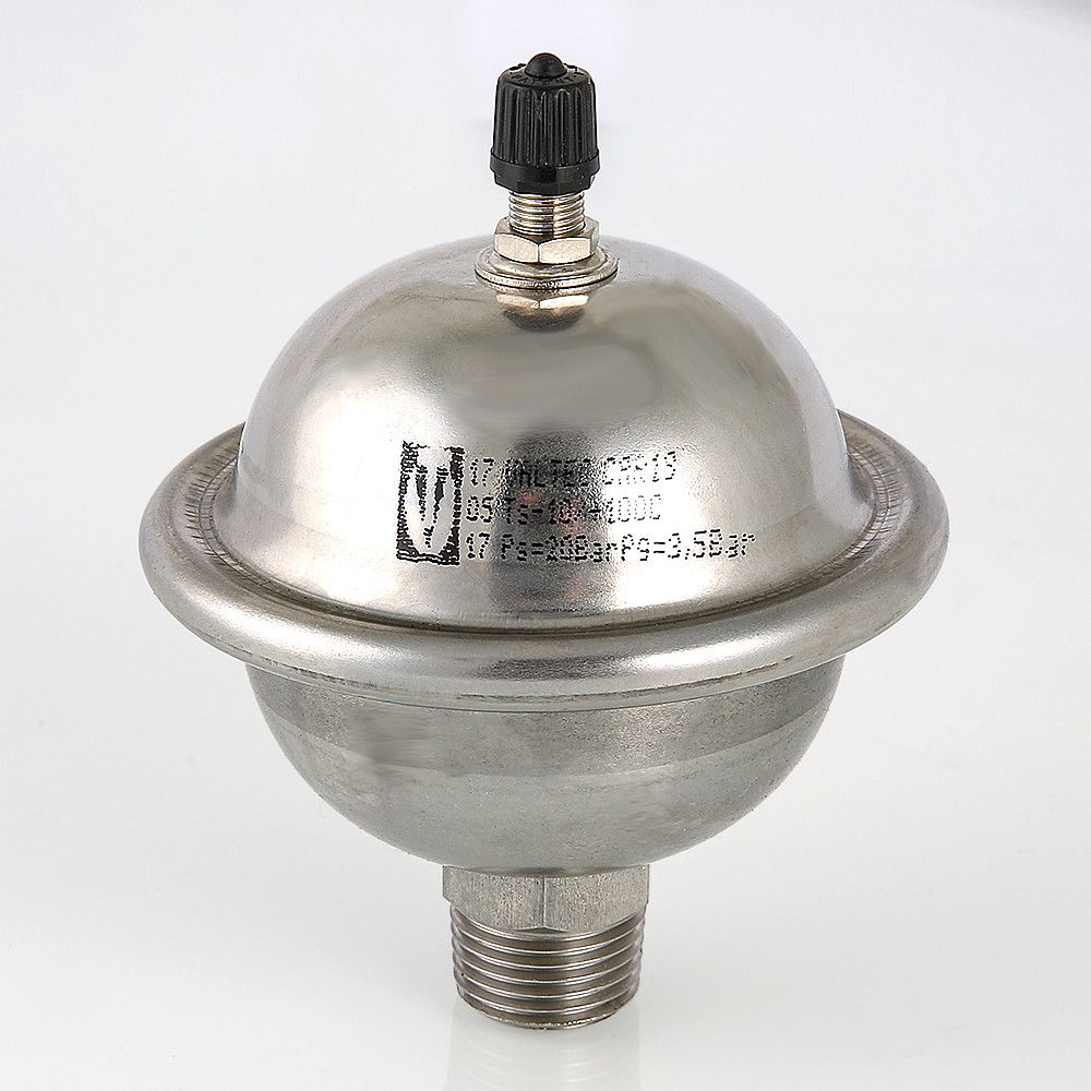 Мембранный гаситель гидроударов VT.CAR 19 предназначен для компенсации скачков давления, возникающих при резком открытии или закрытии запорной арматуры в квартирных системах водоснабжения. Устройство также играет роль расширительного бака, принимающего избыток объема воды, который возникает в трубах при естественном нагреве в отсутствие водоразбора. Компенсатор гидроударов VT.CAR 19 представляет собой миниатюрный бак из нержавеющей стали марки AISI 304L с внутренней разделительной мембраной из эластомера EPDM. Небольшие выпуклости на поверхности мембраны обеспечивают ее неплотное примыкание к корпусу и максимальную площадь контакта мембраны с транспортируемой средой. Емкость гасителя гидравлических ударов VT.CAR 19 – 0,162 л, заводская настройка давления в воздушной камере – 3,5 бара, максимальное рабочее давление в защищаемом квартирном водопроводе – 10 бар, предельное давление при гидроударе – 20 бар, максимальная рабочая температура – 100 °С. Диаметр присоединительной резьбы – 1/2". Размеры (высота х диаметр) изделия – 112 х 88, мм. Заводская настройка обеспечивает защиту трубопроводов с номинальным рабочим давлением 3 бара. При использовании компенсатора в системах с другими параметрами следует перенастроить бак таким образом, чтобы давление в воздушной камере превышало номинальное на 0,5 бара.