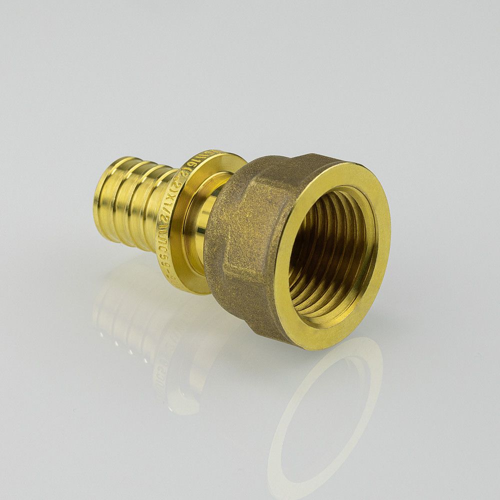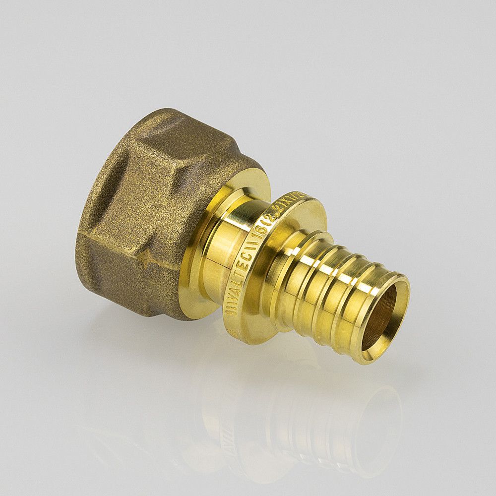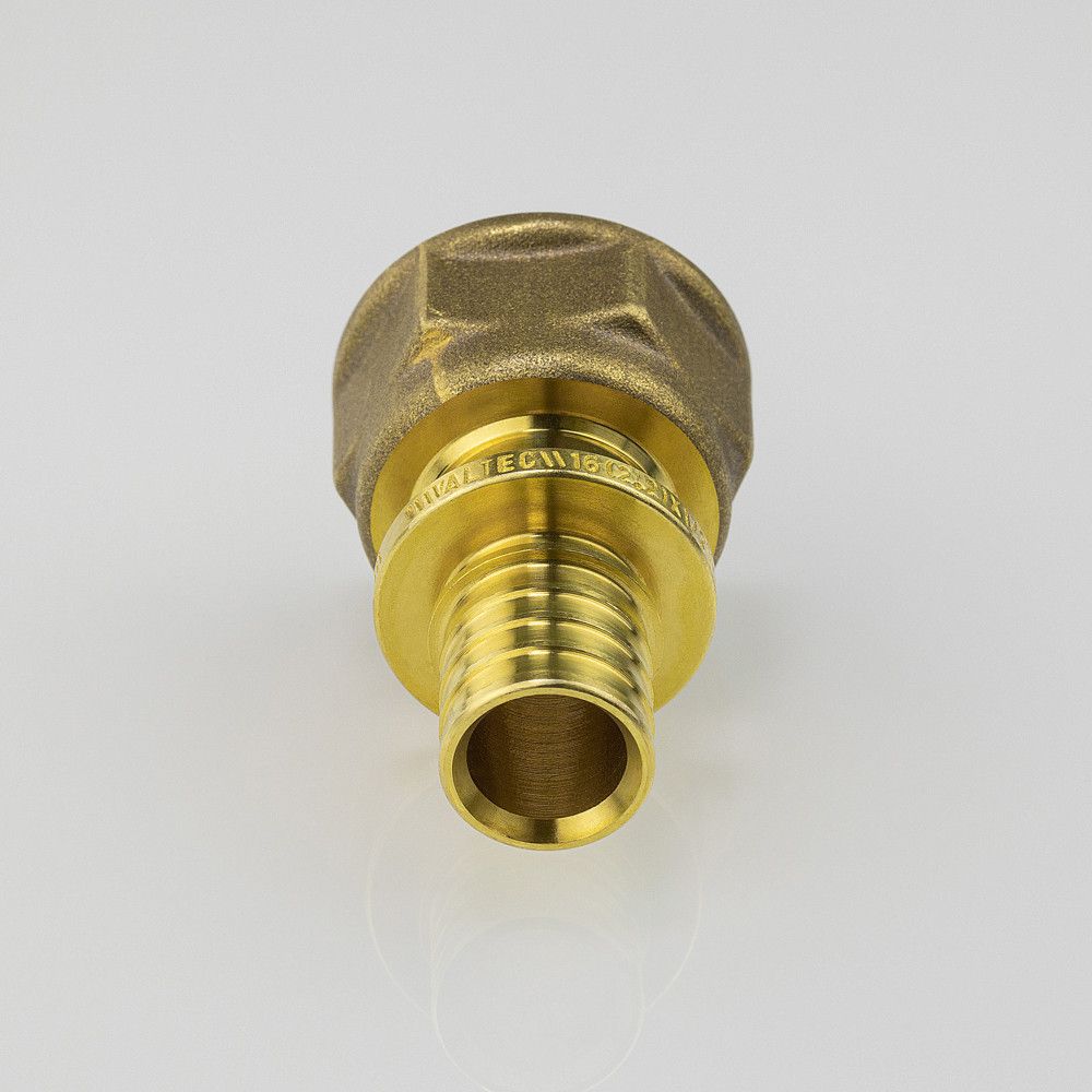 Фитинг надвижной VTm.402.G – прямой латунный аксиальный фитинг с переходом на внутреннюю резьбу для монтажа соединений труб из сшитого полиэтилена.
