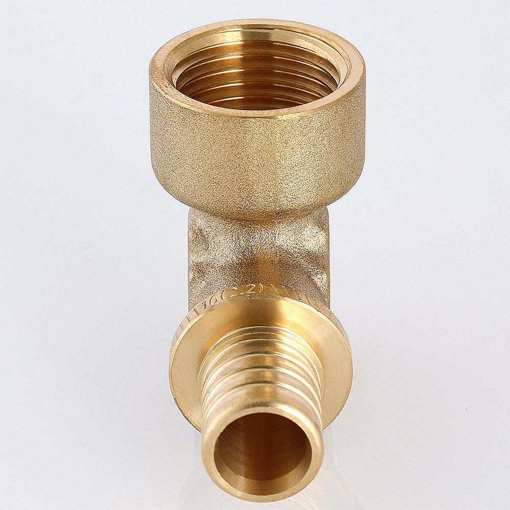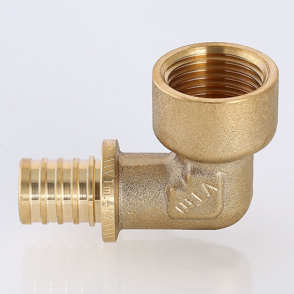 Угольник надвижной VTm.452.G – латунный аксиальный фитинг для соединения под углом 90° трубы из PE-X с резьбовым элементом трубопровода (резьба фитинга – внутренняя).