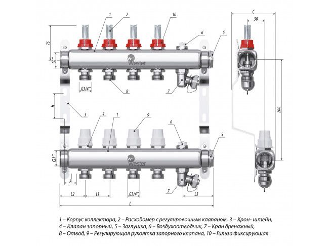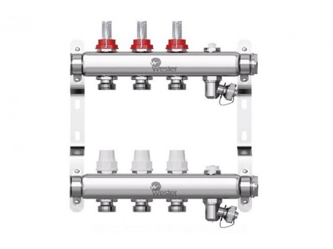 Коллекторы Wester W902 из нержавеющей стали с расходомерами и запорными клапанами предназначены для оптимизации и контроля распределения теплоносителя в системах радиаторного отопления и подогрева пола.