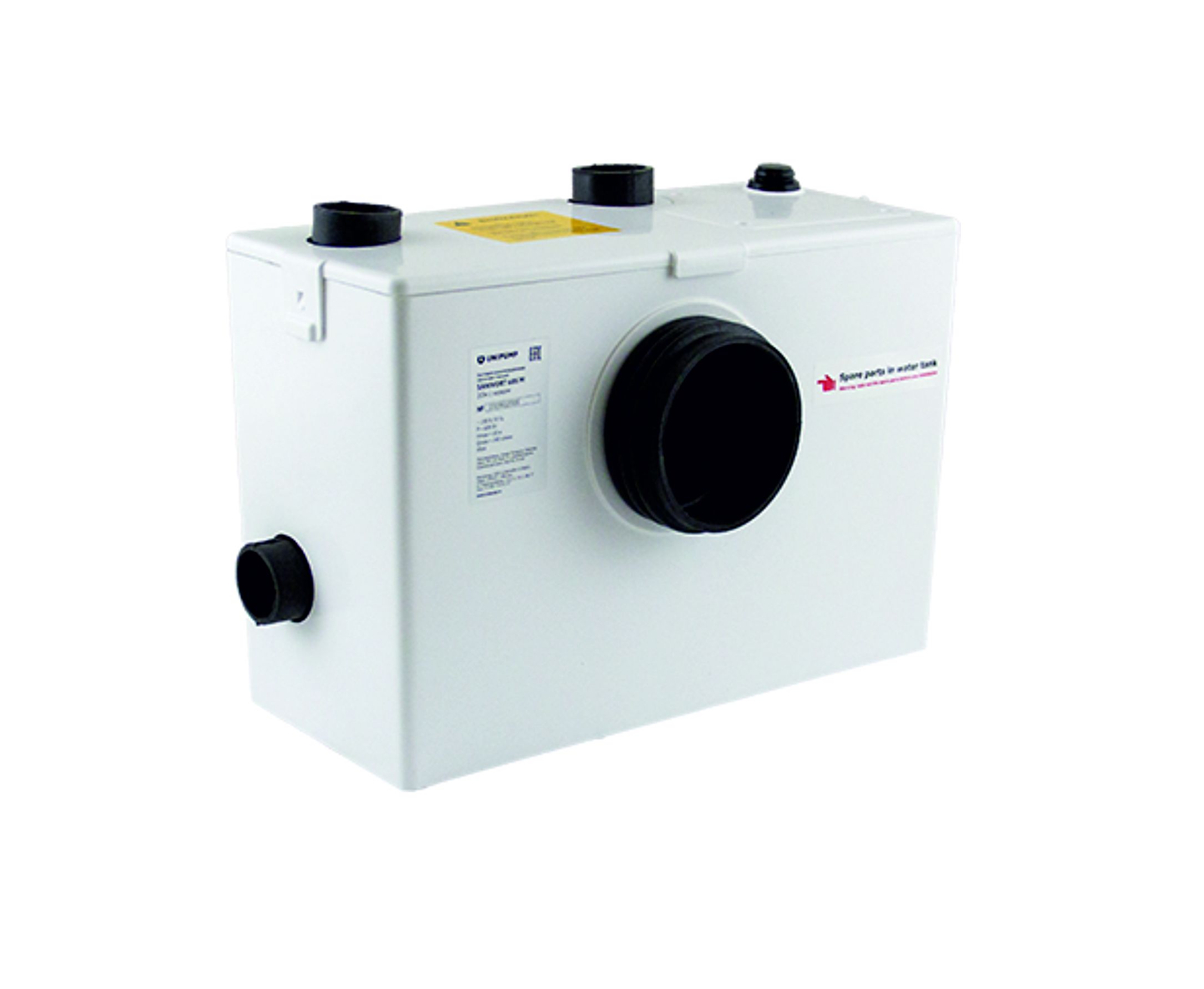 - Вход от туалета (DN 100), 2 входа (DN 40) от раковин и т. д., напорный патрубок (DN 40)