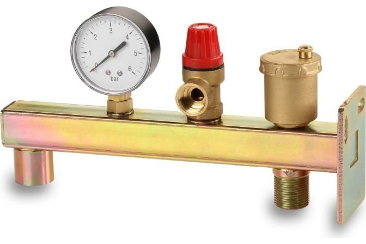 Группа безопасности предназначена для защиты системы отопления/ГВС от превышения давления, сброса избытка воздуха из системы, индикация текущего значения давления. Группа безопасности предназначена для автономных систем водяного отопления и ГВС мощностью до 44 КВт и давлением до 3 бар. Она обеспечивает выполнение следующих функций: