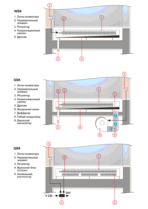 В конвекторах модели QSK (рис.3) вентиляторы не рассчитаны на полное затопление, следовательно их можно использовать только в отдалении от чаши бассейна (порядка 2 метров и более). Вентиляторы имеют специальное исполнение, препятствующее образованию на них налета от растворенного в воде и воздухе хлора. Конвекторы используются с выносным блоком и присоединительным модулем с трансформатором (box for connecting). Выносной блок устанавливается во влагозащищенном месте.